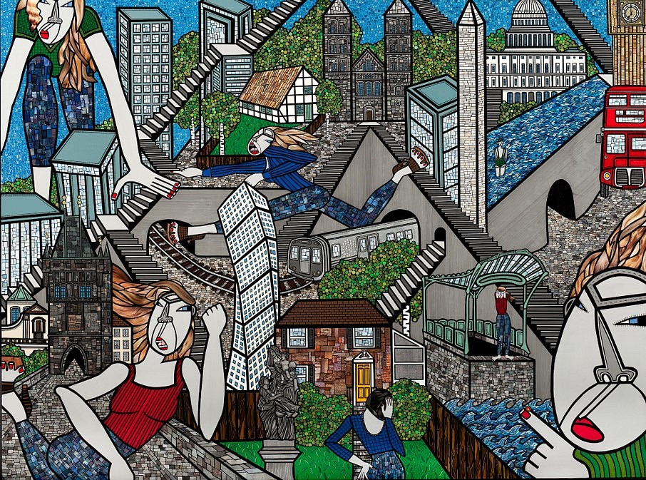 acrylic, ink pen, and paper collage on canvas, 72 x 96 in.