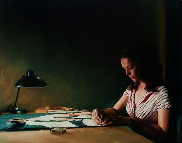 acrylic and paper clothing patterns on canvas, 60 x 48 in.