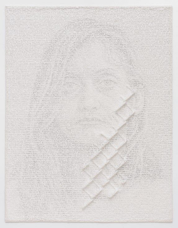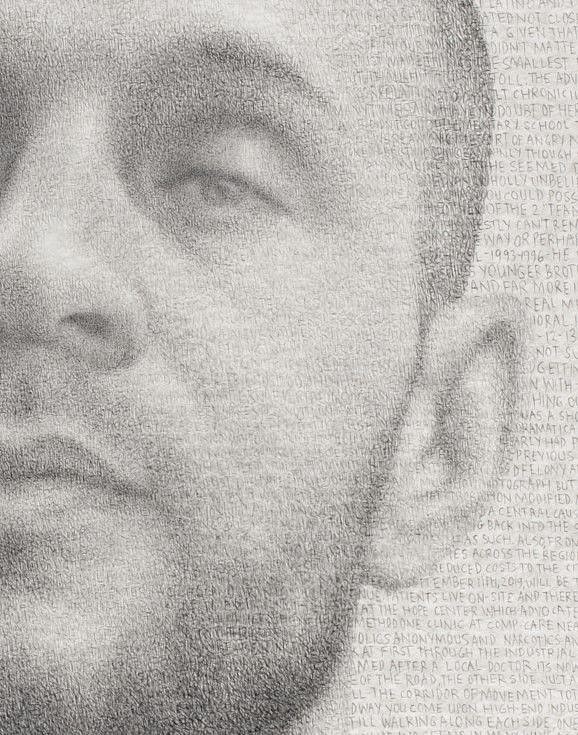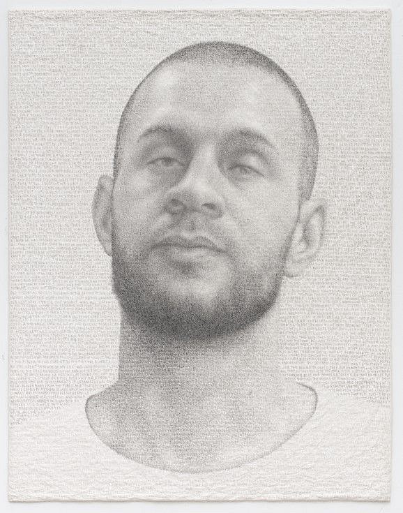 graphite text on handmade paper and steel chain-link fence, 37 x 28 in.