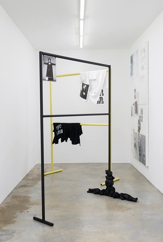 Ready-made metal, artist worn jeans, page tear, spray paint, spray polyurethane foam, artist tape, gum, 82 x 63 x 30 in.